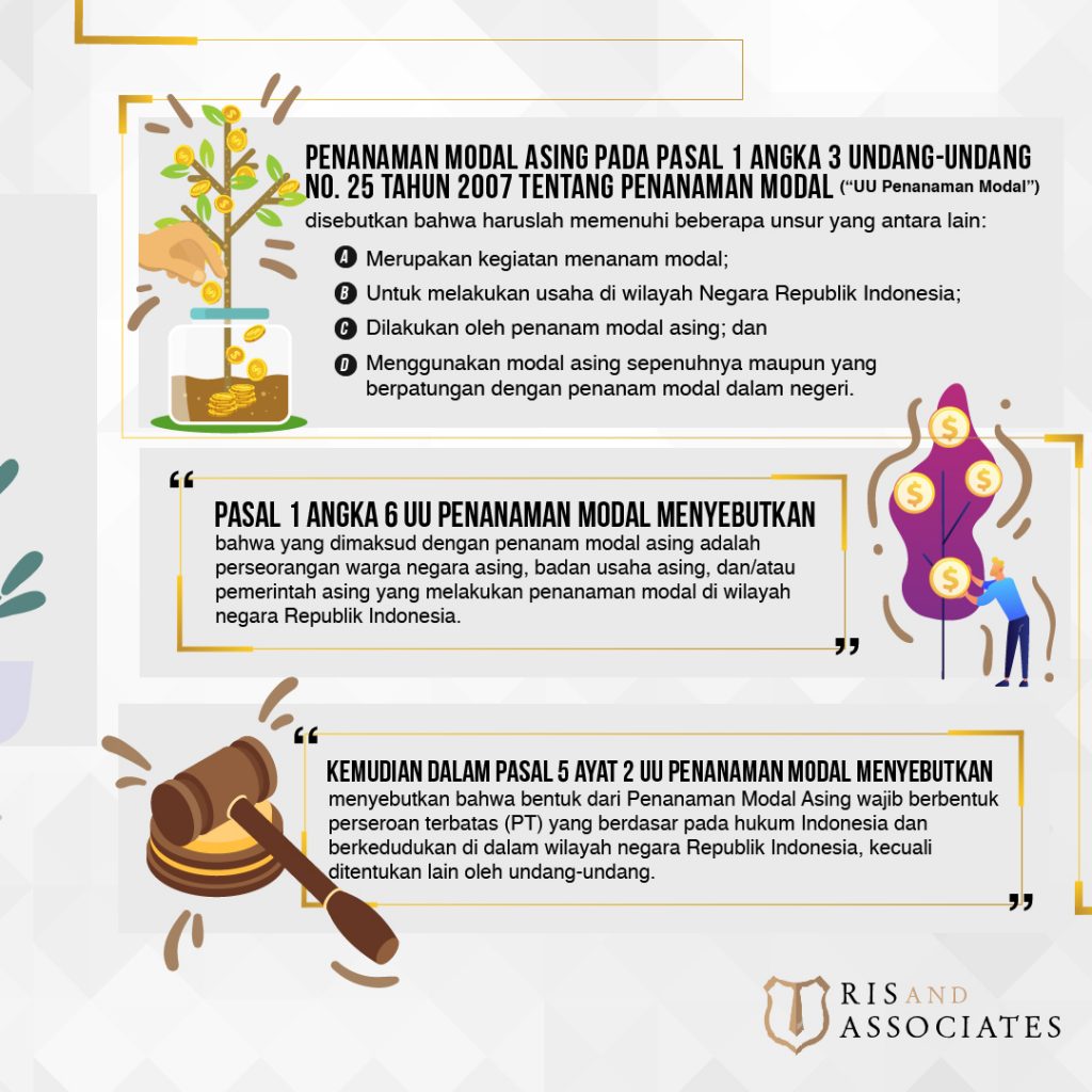 Kemudian dalam Pasal 5 ayat 2 UU Penanaman Modal menyebutkan bahwa bentuk dari Penanaman Modal Asing wajib berbentuk perseroan terbatas (PT) yang berdasar pada hukum Indonesia dan berkedudukan di dalam wilayah negara Republik Indonesia, kecuali ditentukan lain oleh undang-undang.