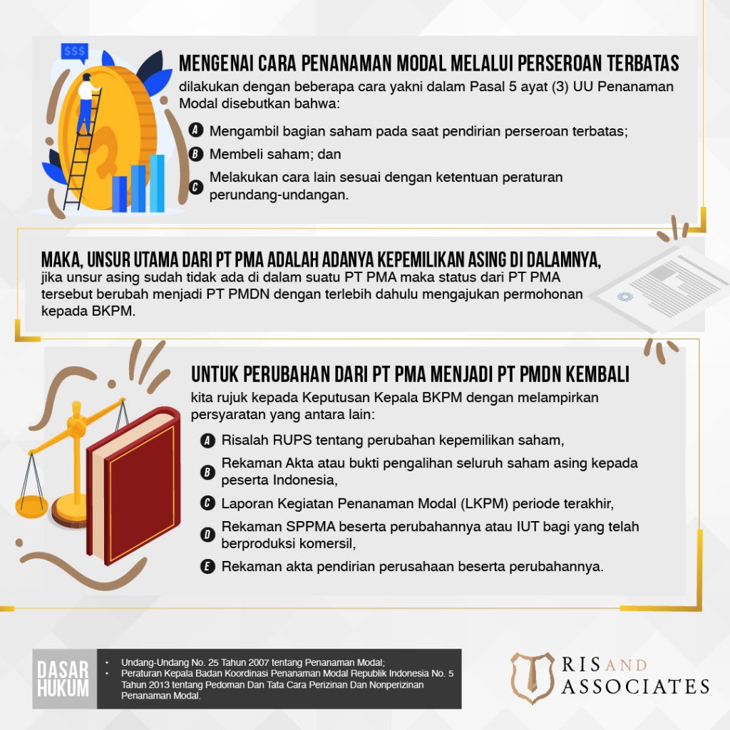 Maka, unsur utama dari PT PMA adalah adanya kepemilikan asing di dalamnya, jika unsur asing sudah tidak ada di dalam suatu PT PMA maka status dari PT PMA tersebut berubah menjadi PT PMDN dengan terlebih dahulu mengajukan permohonan kepada BKPM.