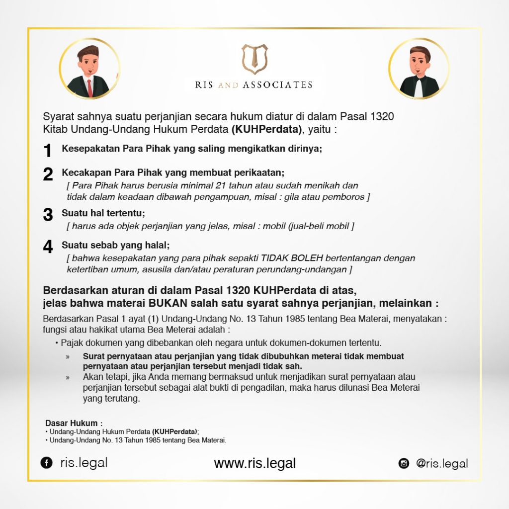 Berdasarkan aturan di dalam Pasal 1320 KUHPerdata di atas, jelas bahwa materai BUKAN salah satu syarat sahnya perjanjian, melainkan :