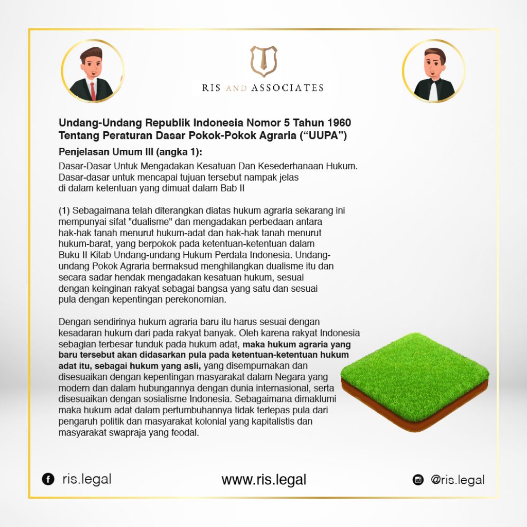 (1) Sebagaimana telah diterangkan diatas hukum agraria sekarang ini mempunyai sifat “dualisme” dan mengadakan perbedaan antara hak-hak tanah menurut hukum-adat dan hak-hak tanah menurut hukum-barat, yang berpokok pada ketentuan-ketentuan dalam Buku II Kitab Undang-undang Hukum Perdata Indonesia. Undang-undang Pokok Agraria bermaksud menghilangkan dualisme itu dan secara sadar hendak mengadakan kesatuan hukum, sesuai dengan keinginan rakyat sebagai bangsa yang satu dan sesuai pula dengan kepentingan perekonomian.
