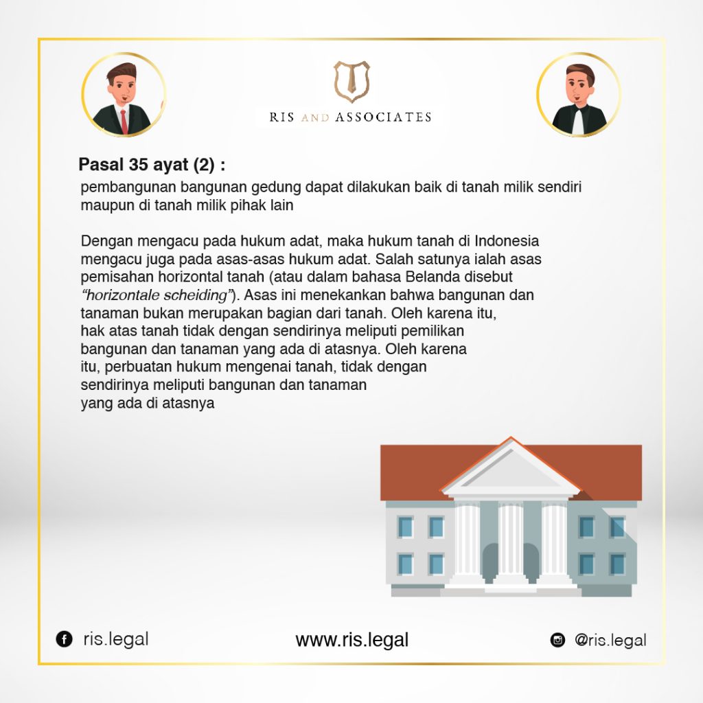 Di dalam peraturan perundang-undangan, penegasan tentang berlakunya asas pemisahan horisontal, selain dari apa yang telah diamanatkan dalam UUPA, dapat dilihat pada Undang-Undang Republik Indonesia Nomor 28 Tahun 2002 TentangBangunan Gedung (“UU Bangunan”).
