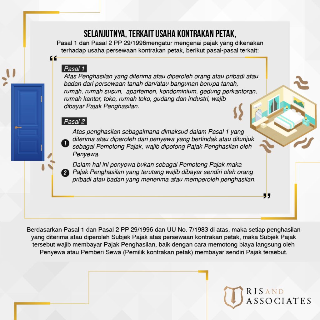 Selanjutnya, terkait usaha kontrakan petak, Pasal 1 dan Pasal 2 PP 29/1996mengatur mengenai pajak yang dikenakan terhadap usaha persewaan kontrakan petak, berikut pasal-pasal terkait: