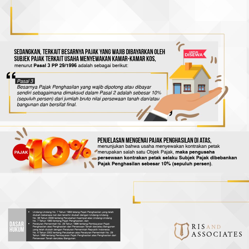 Penjelasan mengenai Pajak Penghasilan di atas, menunjukan bahwa usaha menyewakan kontrakan petak merupakan salah satu Objek Pajak, maka pengusaha persewaan kontrakan petak selaku Subjek Pajak dibebankan Pajak Penghasilan sebesar 10% (sepuluh persen).