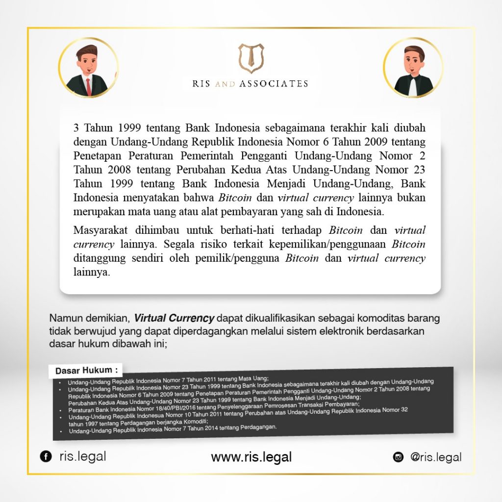 Bank Indonesia sebagaimana terakhir kali diubah dengan Undang-Undang Republik Indonesia Nomor 6 Tahun 2009 tentang Penetapan Peraturan Pemerintah Pengganti Undang-Undang Nomor 2 Tahun 2008 tentang Perubahan Kedua Atas Undang-Undang Nomor 23 Tahun 1999 tentang Bank Indonesia Menjadi Undang-Undang, Bank Indonesia menyatakan bahwa Bitcoin dan virtual currency lainnya bukan merupakan mata uang atau alat pembayaran yang sah di Indonesia.