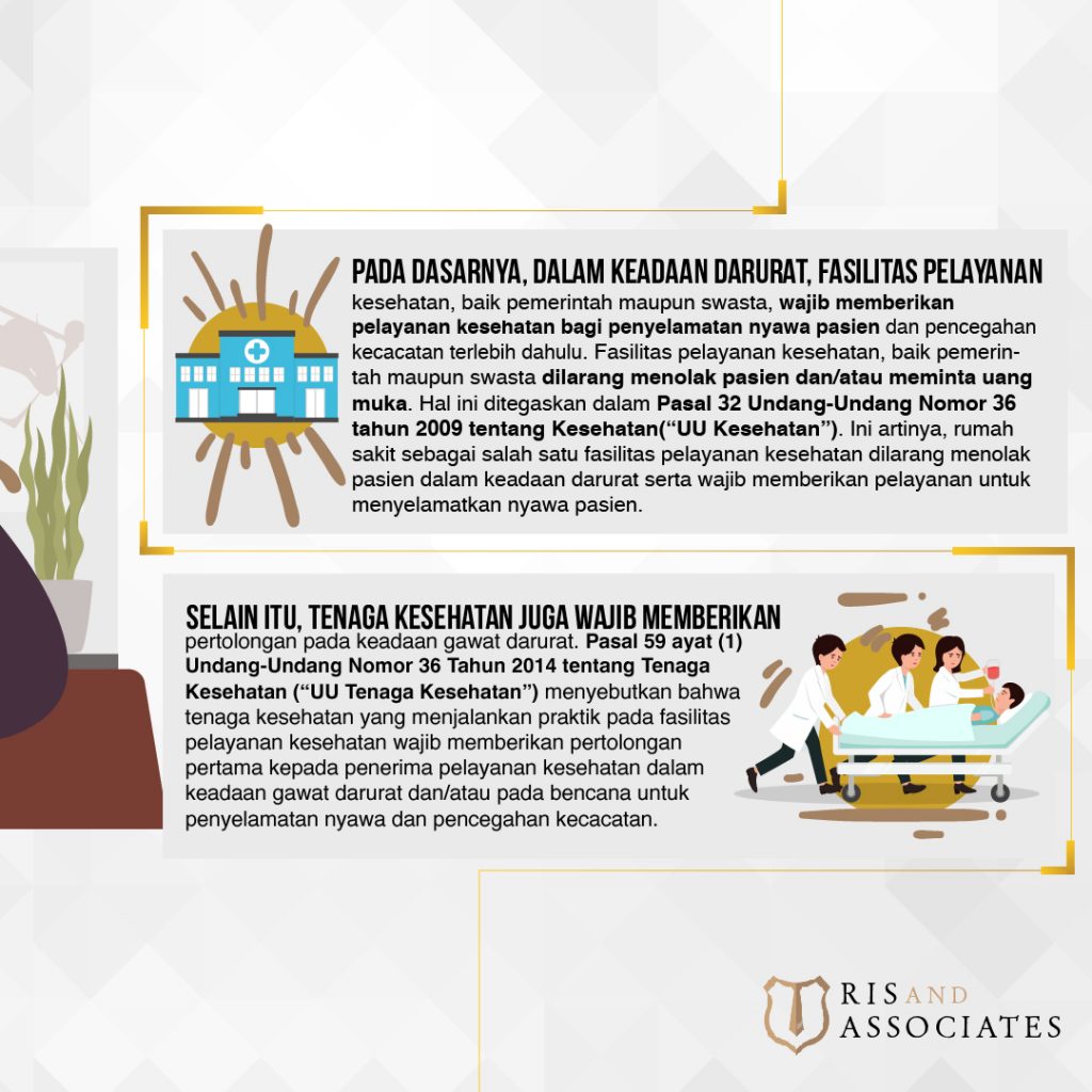 Pada dasarnya, dalam keadaan darurat, fasilitas pelayanan kesehatan, baik pemerintah maupun swasta, wajib memberikan pelayanan kesehatan bagi penyelamatan nyawa pasien dan pencegahan kecacatan terlebih dahulu. Fasilitas pelayanan kesehatan, baik pemerintah maupun swasta dilarang menolak pasien dan/atau meminta uang muka. Hal ini ditegaskan dalam Pasal 32 Undang-Undang Nomor 36 tahun 2009 tentang Kesehatan(“UU Kesehatan”). Ini artinya, rumah sakit sebagai salah satu fasilitas pelayanan kesehatan dilarang menolak pasien dalam keadaan darurat serta wajib memberikan pelayanan untuk menyelamatkan nyawa pasien.
