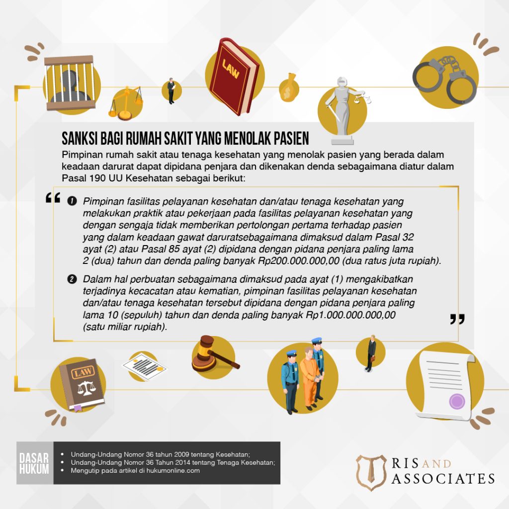 Pimpinan rumah sakit atau tenaga kesehatan yang menolak pasien yang berada dalam keadaan darurat dapat dipidana penjara dan dikenakan denda sebagaimana diatur dalam Pasal 190 UU Kesehatan sebagai berikut: