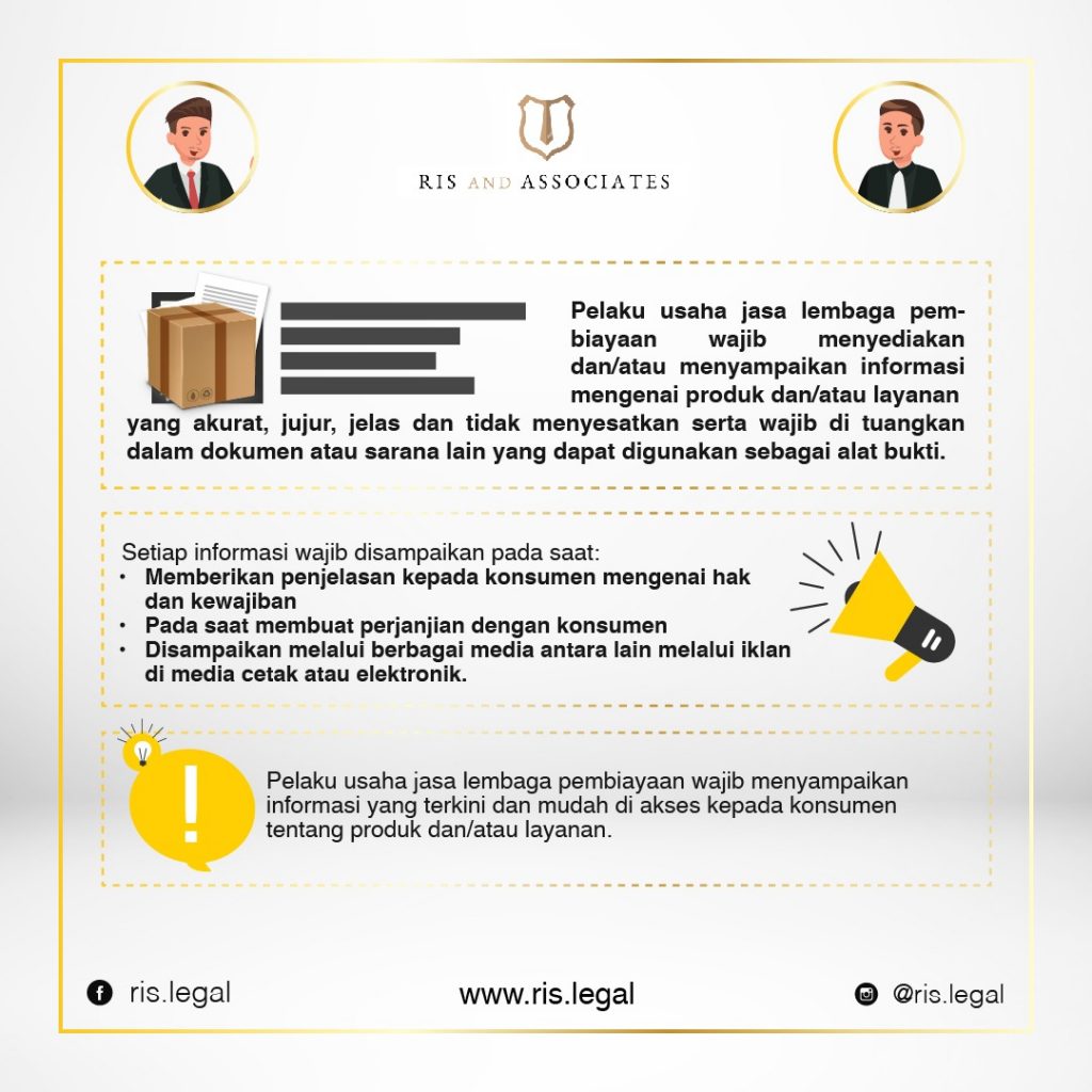 - Pelaku usaha jasa lembaga pembiayaan wajib menyediakan dan/atau menyampaikan informasi mengenai produk dan/atau layanan yang akurat, jujur, jelas dan tidak menyesatkan serta wajib di tuangkan dalam dokumen atau sarana lain yang dapat digunakan sebagai alat bukti.