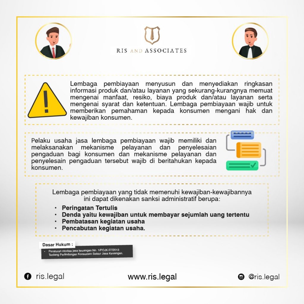 - Lembaga pembiayaan menyusun dan menyediakan ringkasan informasi produk dan/atau layanan yang sekurang-kurangnya memuat mengenai manfaat, resiko, biaya produk dan/atau layanan serta mengenai syarat dan ketentuan. Lembaga pembiayaan wajib untuk memberikan pemahaman kepada konsumen mengani hak dan kewajiban konsumen.