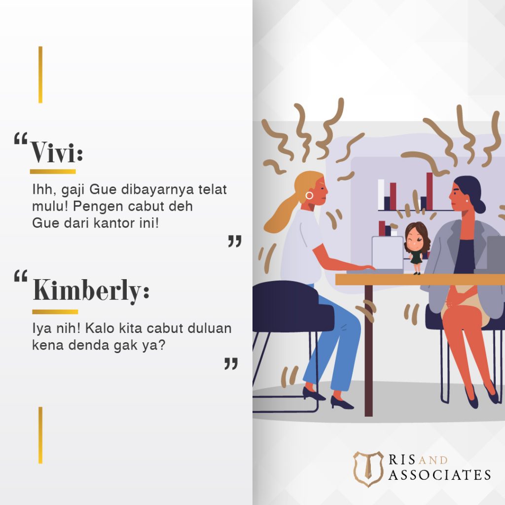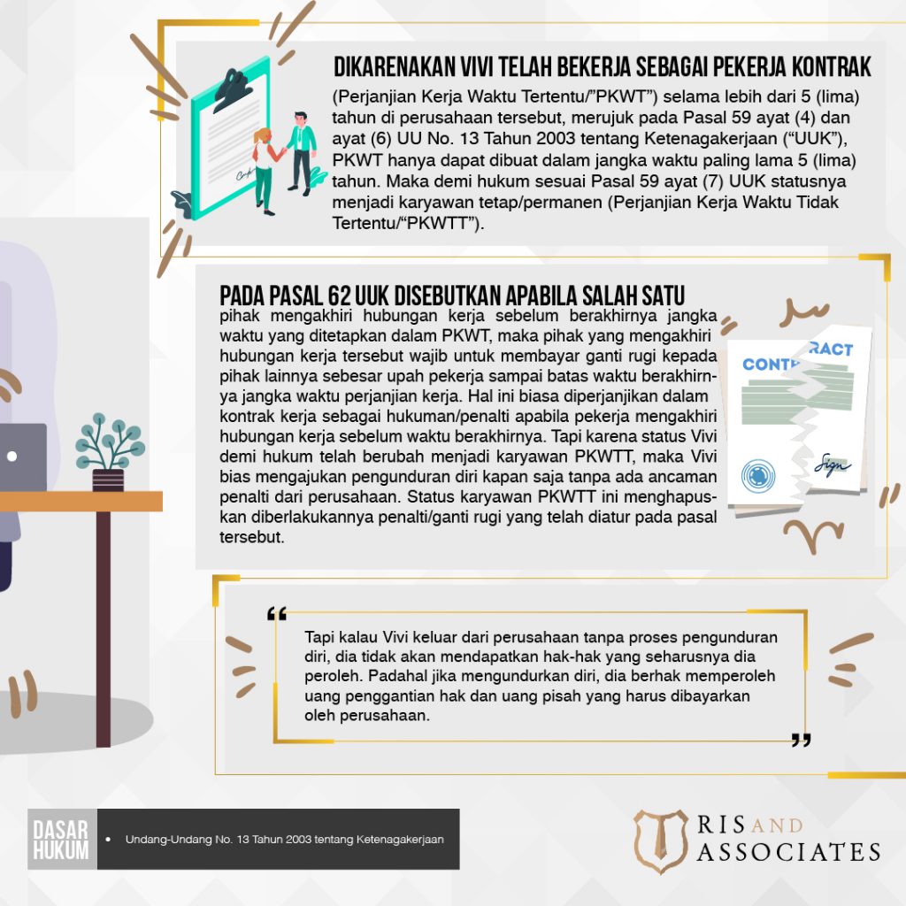 Pada Pasal 62 UUK disebutkan apabila salah satu pihak mengakhiri hubungan kerja sebelum berakhirnya jangka waktu yang ditetapkan dalam PKWT, maka pihak yang mengakhiri hubungan kerja tersebut wajib untuk membayar ganti rugi kepada pihak lainnya sebesar upah pekerja sampai batas waktu berakhirnya jangka waktu perjanjian kerja. Hal ini biasa diperjanjikan dalam kontrak kerja sebagai hukuman/penalti apabila pekerja mengakhiri hubungan kerja sebelum waktu berakhirnya. Tapi karena status Vivi demi hukum telah berubah menjadi karyawan PKWTT, maka Vivi bias mengajukan pengunduran diri kapan saja tanpa ada ancaman penalti dari perusahaan. Status karyawan PKWTT ini menghapuskan diberlakukannya penalti/ganti rugi yang telah diatur pada pasal tersebut.