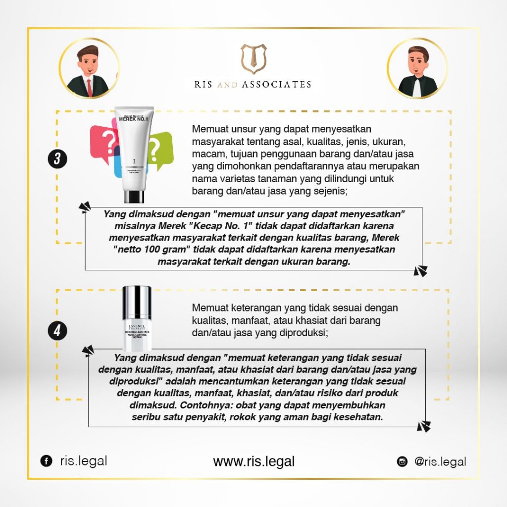 - Memuat unsur yang dapat menyesatkan masyarakat tentang asal, kualitas, jenis, ukuran, macam, tujuan penggunaan barang dan/atau jasa yang dimohonkan pendaftarannya atau merupakan nama varietas tanaman yang dilindungi untuk barang dan/atau jasa yang sejenis; [Yang dimaksud dengan “memuat unsur yang dapat menyesatkan” misalnya Merek “Kecap No. 1” tidak dapat didaftarkan karena menyesatkan masyarakat terkait dengan kualitas barang, Merek “netto 100 gram” tidak dapat didaftarkan karena menyesatkan masyarakat terkait dengan ukuran barang.]