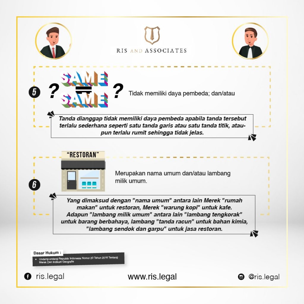 - Tidak memiliki daya pembeda; dan/atau [Tanda dianggap tidak memiliki daya pembeda apabila tanda tersebut terlalu sederhana seperti satu tanda garis atau satu tanda titik, ataupun terlalu rumit sehingga tidak jelas.]