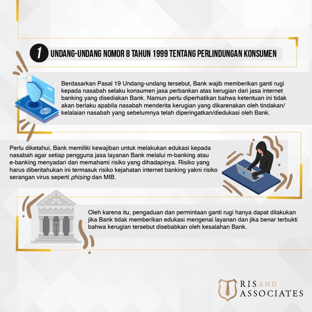 Berdasarkan Pasal 19 Undang-undang tersebut, Bank wajib memberikan ganti rugi kepada nasabah selaku konsumen jasa perbankan atas kerugian dari jasa internet banking yang disediakan Bank. Namun perlu diperhatikan bahwa ketentuan ini tidak akan berlaku apabila nasabah menderita kerugian yang dikarenakan oleh tindakan/kelalaian nasabah yang sebelumnya telah diperingatkan/diedukasi oleh Bank.