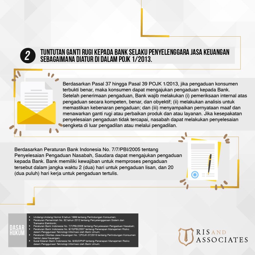 - Tuntutan ganti rugi kepada Bank selaku Penyelenggara Jasa Keuangan sebagaimana diatur di dalam POJK 1/2013.