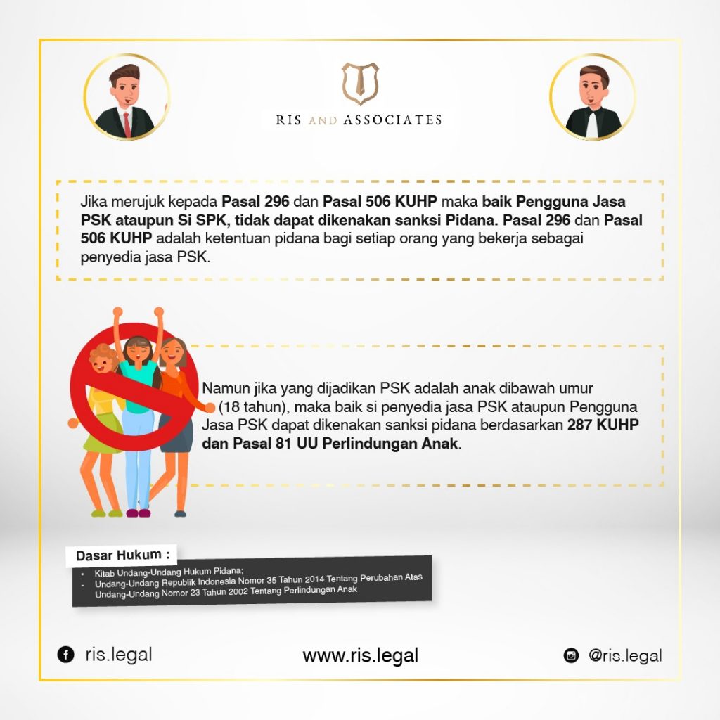 Namun jika yang dijadikan PSK adalah anak dibawah umur (18 tahun), maka baik si penyedia jasa PSK ataupun Pengguna Jasa PSK dapat dikenakan sanksi pidana berdasarkan 287 KUHP dan Pasal 81 UU Perlindungan Anak.