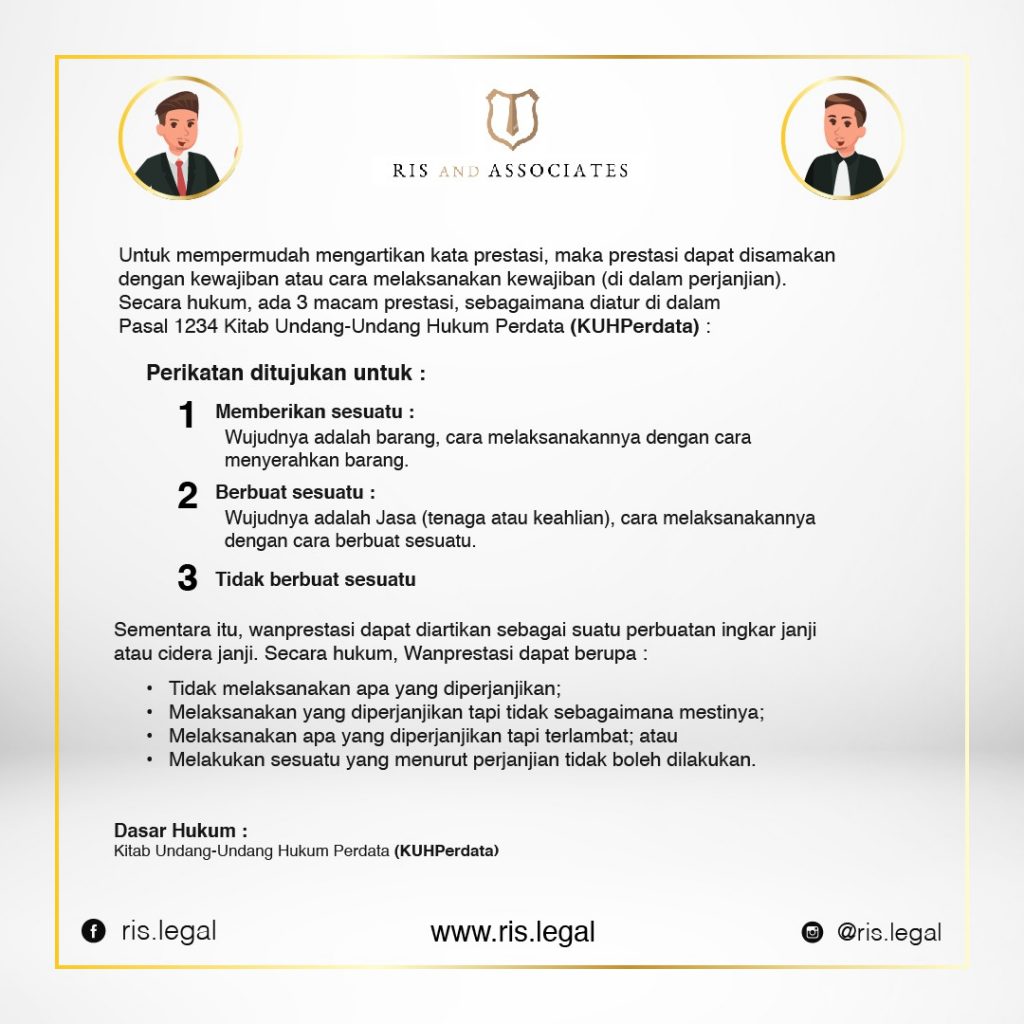 Secara hukum, ada 3 macam prestasi, sebagaimana diatur di dalam Pasal 1234 Kitab Undang-Undang Hukum Perdata (KUHPerdata) :