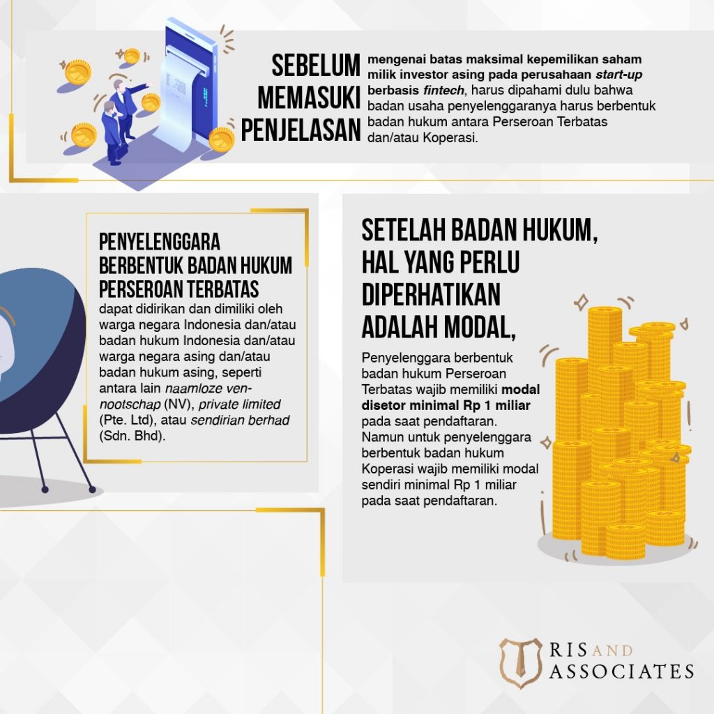 Sebelum memasuki penjelasan mengenai batas maksimal kepemilikan saham milik investor asing pada perusahaan start-up berbasis fintech, harus dipahami dulu bahwa badan usaha penyelenggaranya harus berbentuk badan hukum antara Perseroan Terbatas dan/atau Koperasi.