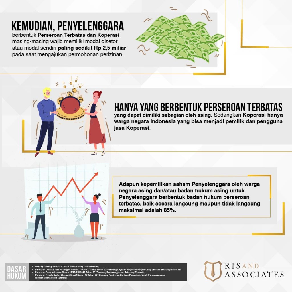 Setelah badan hukum, hal yang perlu diperhatikan adalah modal, Penyelenggara berbentuk badan hukum Perseroan Terbatas wajib memiliki modal disetor minimal Rp 1 miliar pada saat pendaftaran. Namun untuk penyelenggara berbentuk badan hukum Koperasi wajib memiliki modal sendiri minimal Rp 1 miliar pada saat pendaftaran.