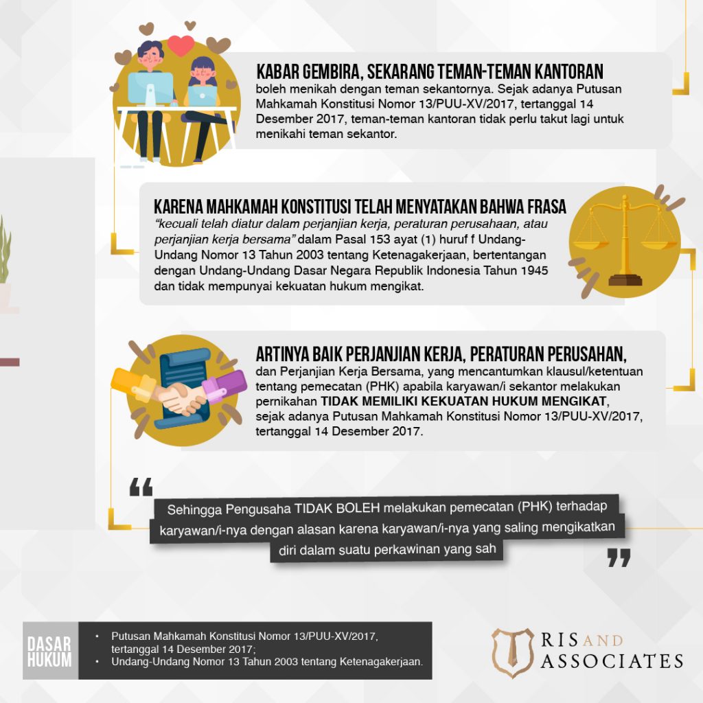 Artinya baik Perjanjian Kerja, Peraturan Perusahan, dan Perjanjian Kerja Bersama, yang mencantumkan klausul/ketentuan tentang pemecatan (PHK) apabila karyawan/i sekantor melakukan pernikahan TIDAK MEMILIKI KEKUATAN HUKUM MENGIKAT, sejak adanya Putusan Mahkamah Konstitusi Nomor 13/PUU-XV/2017, tertanggal 14 Desember 2017.