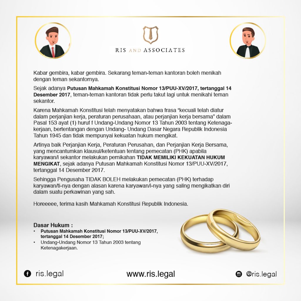 Artinya baik Perjanjian Kerja, Peraturan Perusahan, dan Perjanjian Kerja Bersama, yang mencantumkan klausul/ketentuan tentang pemecatan (PHK) apabila karyawan/i sekantor melakukan pernikahan TIDAK MEMILIKI KEKUATAN HUKUM MENGIKAT, sejak adanya Putusan Mahkamah Konstitusi Nomor 13/PUU-XV/2017, tertanggal 14 Desember 2017.