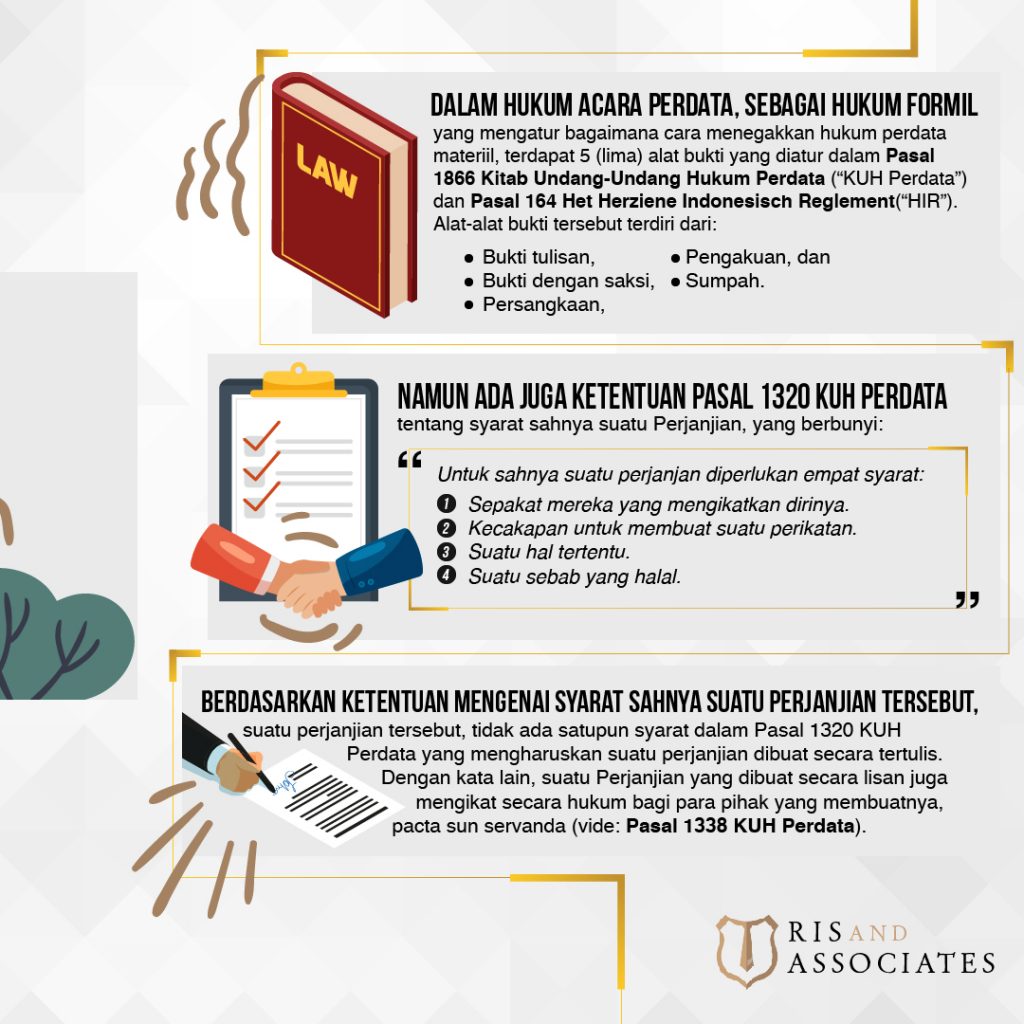 Berdasarkan ketentuan mengenai syarat sahnya suatu perjanjian tersebut, tidak ada satupun syarat dalam Pasal 1320 KUH Perdata yang mengharuskan suatu perjanjian dibuat secara tertulis. Dengan kata lain, suatu Perjanjian yang dibuat secara lisan juga mengikat secara hukum bagi para pihak yang membuatnya, pacta sun servanda (vide: Pasal 1338 KUH Perdata).