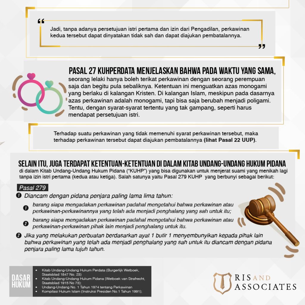 Selain itu, juga terdapat ketentuan-ketentuan di dalam Kitab Undang-Undang Hukum Pidana (“KUHP”) yang bisa digunakan untuk menjerat suami yang menikah lagi tanpa izin istri pertama (kedua atau ketiga). Salah satunya yaitu Pasal 279 KUHP yang berbunyi sebagai berikut: