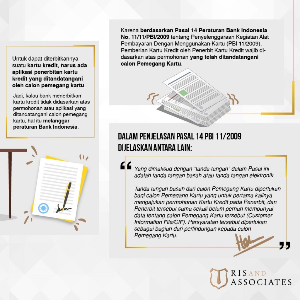 Untuk dapat diterbitkannya suatu kartu kredit, harus ada aplikasi penerbitan kartu kredit yang ditandatangani oleh calon pemegang kartu. Jadi, kalau bank menerbitkan kartu kredit tidak didasarkan atas permohonan atau aplikasi yang ditandatangani calon pemegang kartu, hal itu melanggar peraturan Bank Indonesia.