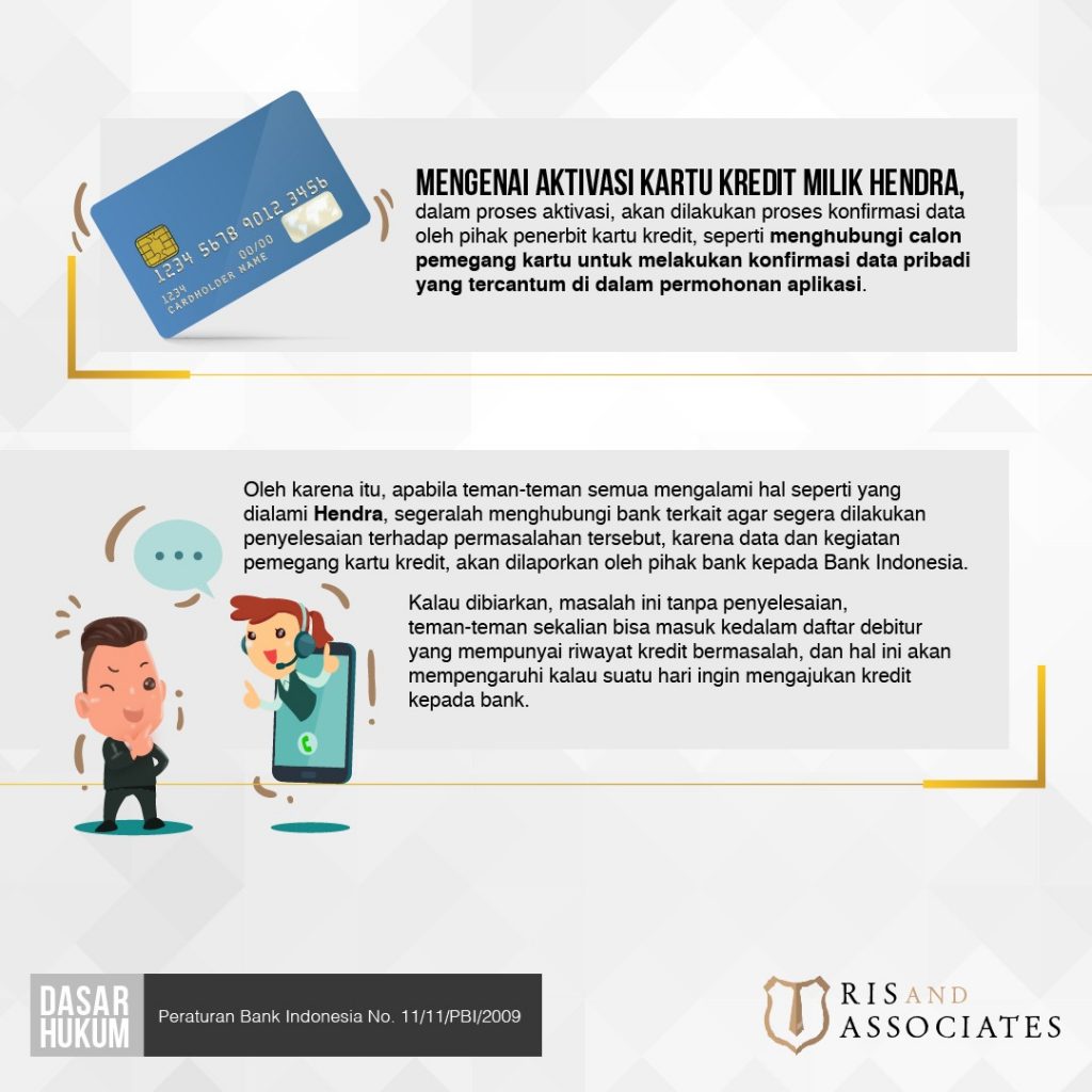 Mengenai aktivasi kartu kredit milik Hendra, dalam proses aktivasi, akan dilakukan proses konfirmasi data oleh pihak penerbit kartu kredit, seperti menghubungi calon pemegang kartu untuk melakukan konfirmasi data pribadi yang tercantum di dalam permohonan aplikasi.